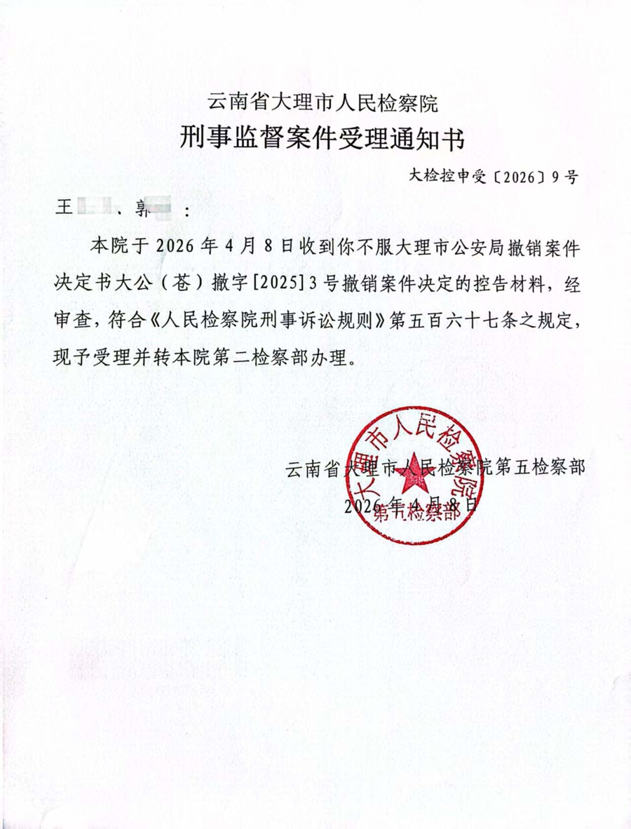 王一凯死一火后的第240天,郭凯和丈夫王浩收到了大理市东谈主民张望院出具的刑事立案监督受理见告书。