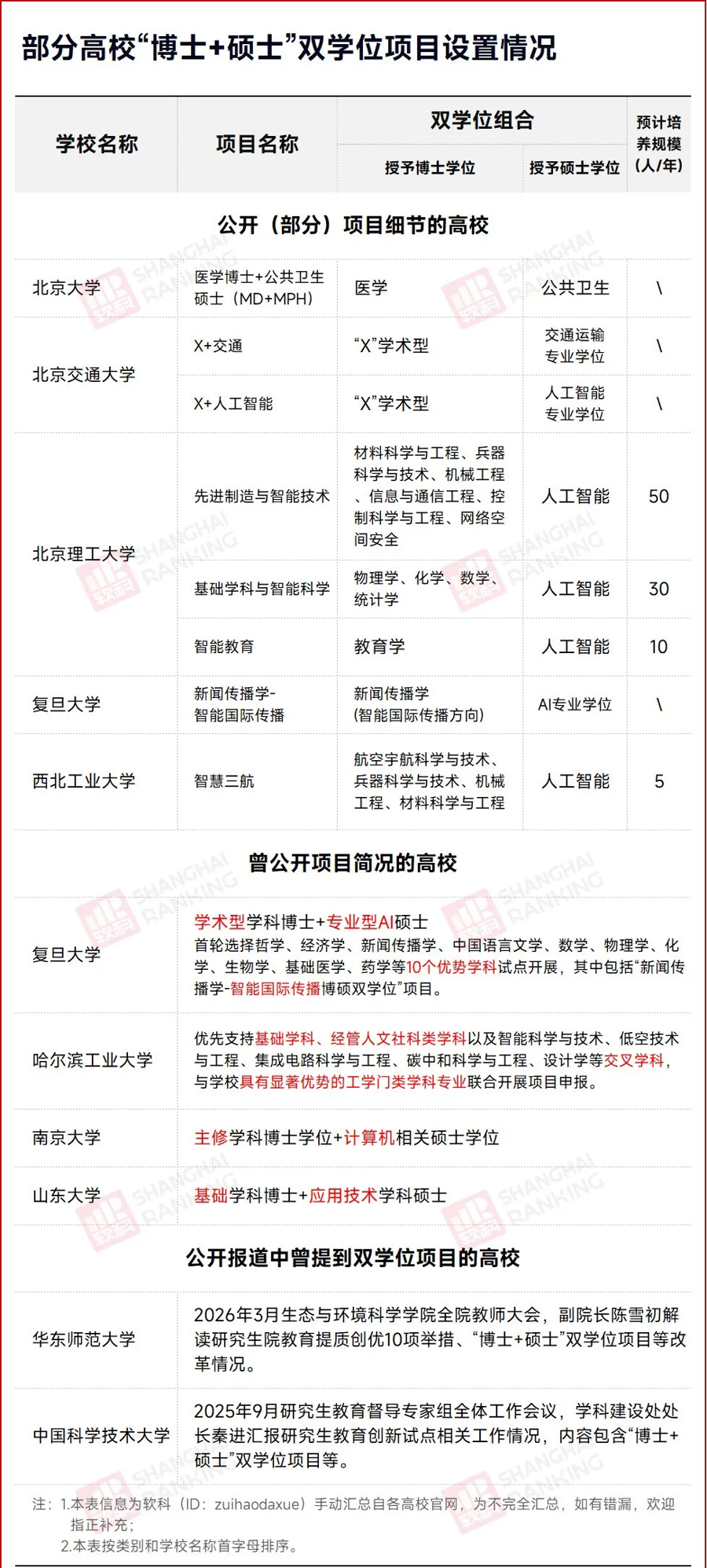 部分高校“博士+硕士”双学位试点神态成立。(开首:软科)
