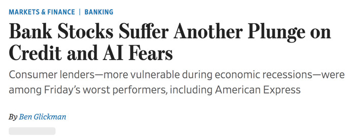[环球网财经轮廓报谈]据TheWallStreetJournal等外媒报谈,受信贷风险清晰与东谈主工智能对经济冲击的双重负忧影响,好意思股金融板块当地时刻周五遭逢剧烈抛售,大型银行、耗尽贷款机构及持续金融股多量重挫,市集避险情怀快速升温。