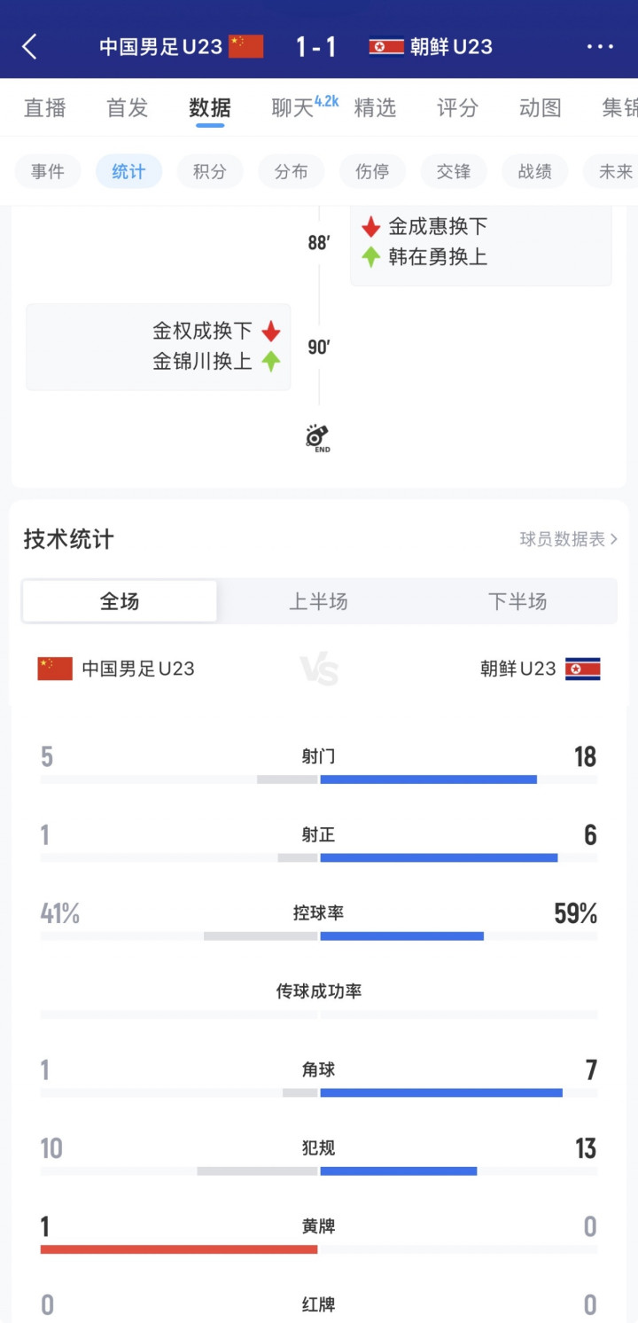 直播吧03月28日讯U23国足1-1战平朝鲜,全场比赛U23国足唯有1次射正,MILAN SPORTS此次射正来自向余望的点球。