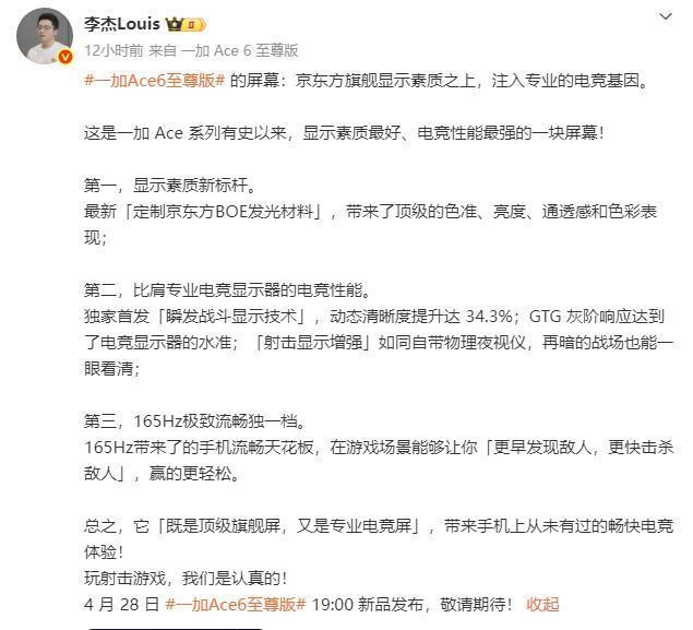 对此, @李杰Louis 示意,“此次一加Ace6至尊版,咱们不仅领有最顶级的画质,还与京东方的伙伴们强强聚拢,把专科PC电竞显现器的时间带得手机上,成就移动端最强的165Hz电竞显现,4月28日拿居品讲话。”