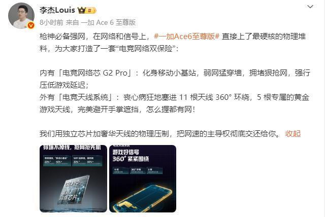 对于一加Ace6至尊版在聚积方面的普及, @李杰Louis 回归称,“枪神必备强网,在聚积和信号上,#一加Ace6至尊版# 径直上了最硬核的物理堆料,为大家打造了一套“电竞聚积双保障”: