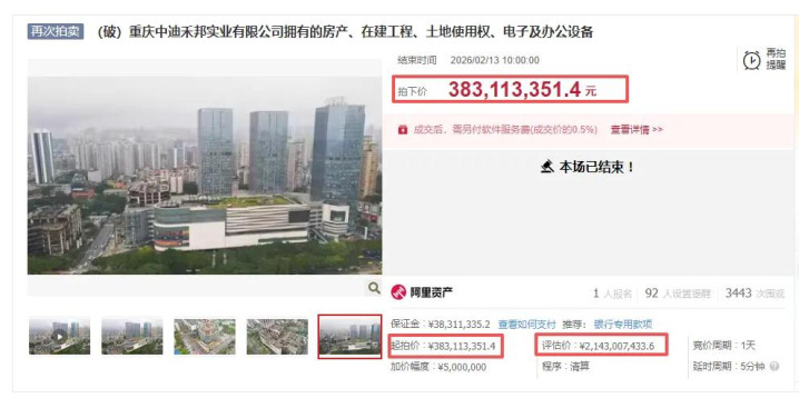 阿里法拍剖析,方针物评估价为21.43亿元,以3.831亿元被拍下,降价超17亿元。