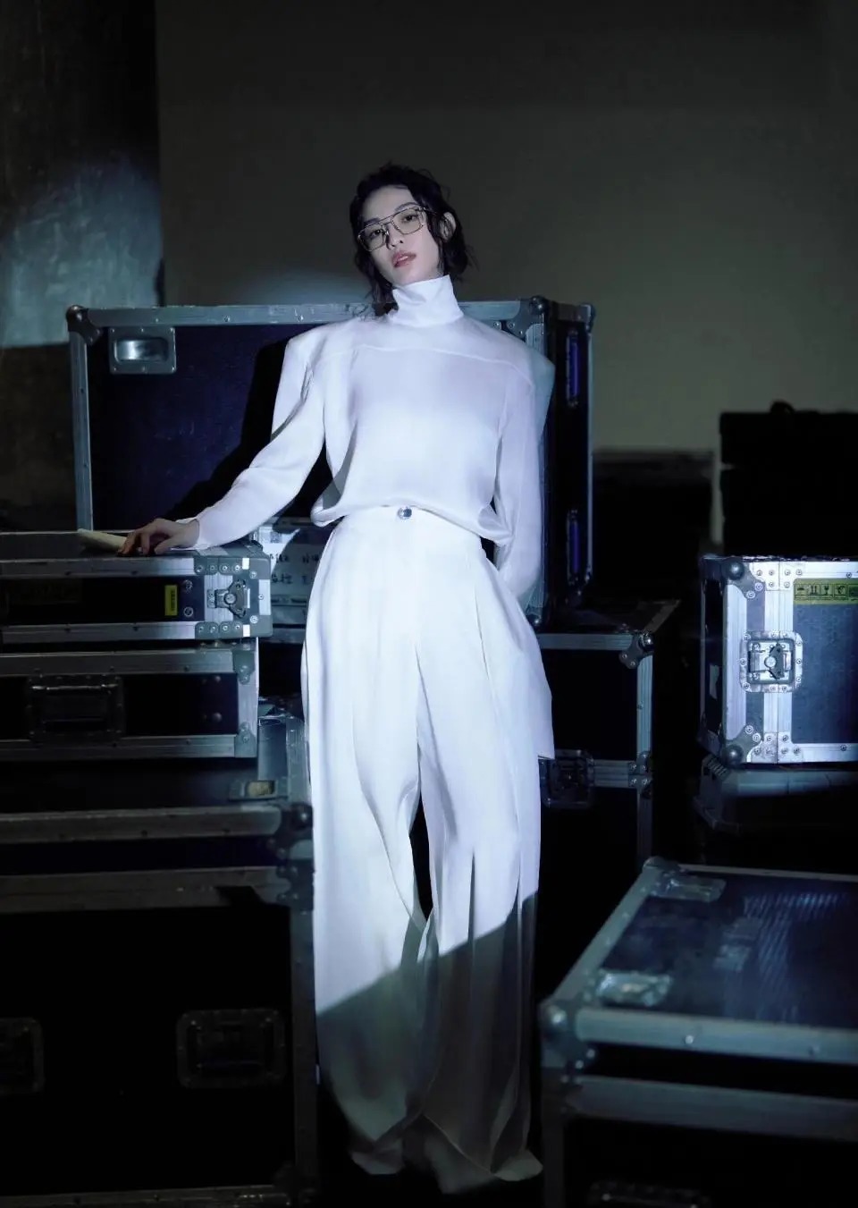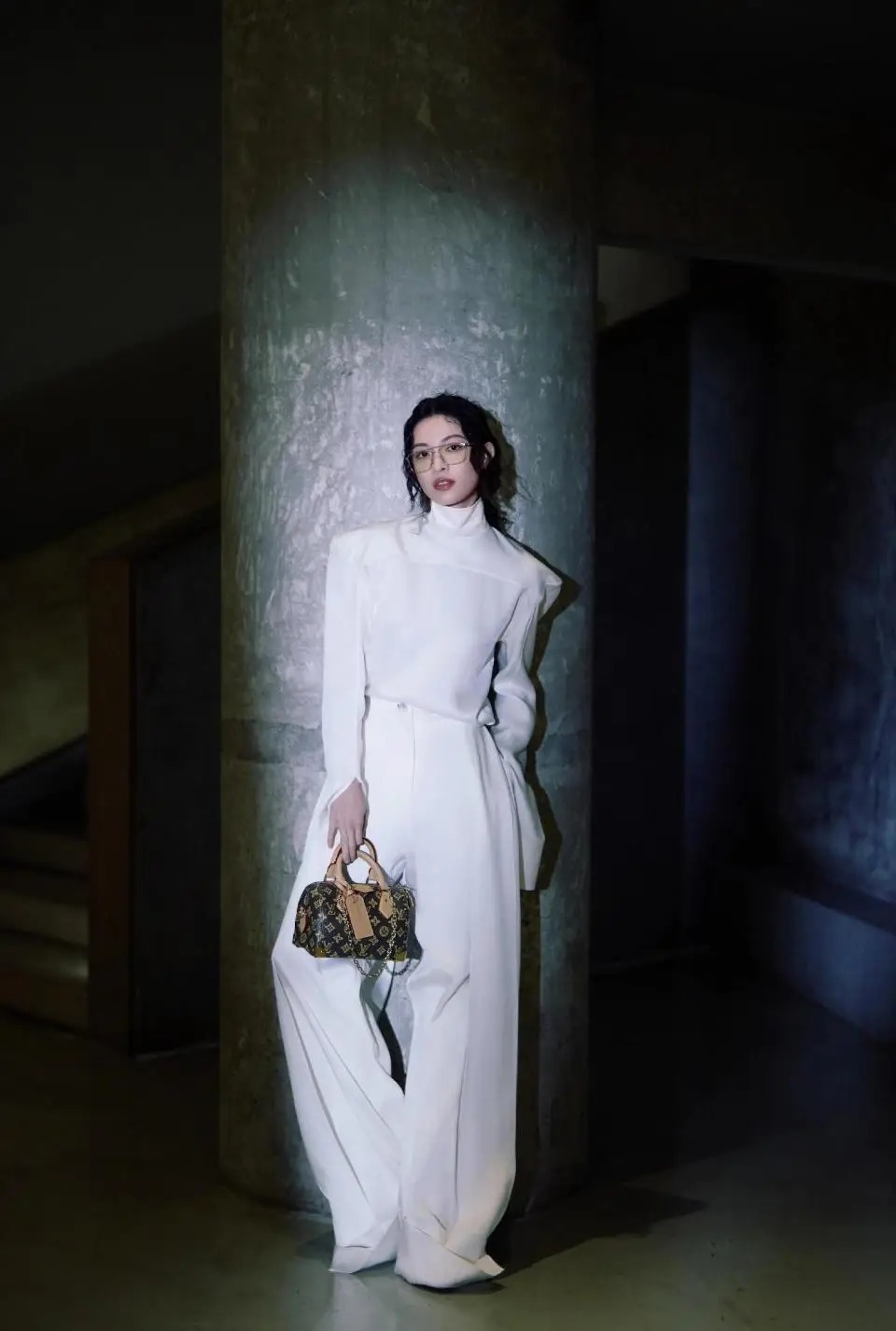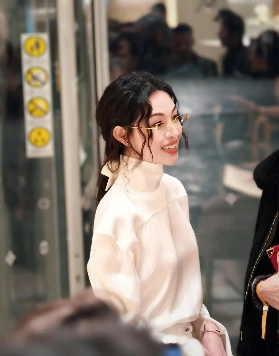 而扫数造型的灵魂,无疑是那副纤细到险些隐形的金丝边无框眼镜。 它透顶禁锢了东谈主们对“明星戴眼镜是装潢”的刻板印象。 莫得夸张的造型,莫得沉着的边框,就是最从简的几何线条,轻轻架在鼻梁上。 透明镜片背面,是她一如既往冰寒又带点强横的目光。