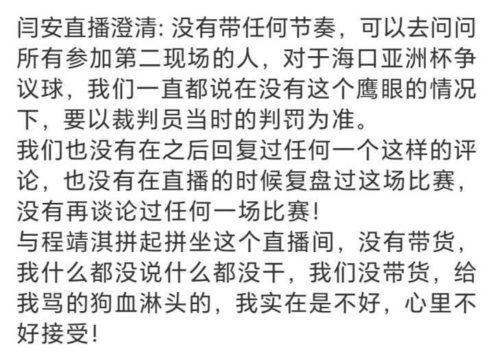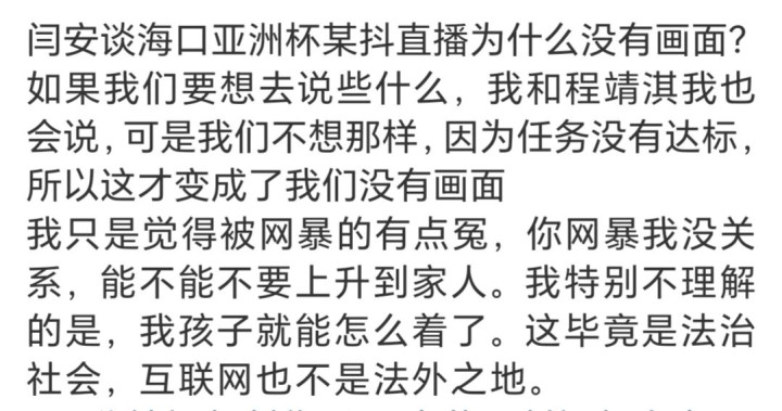 前国手闫安和程靖淇在海口第二现场直播的这场比赛,由于在直播中发表了我方对这个球的宗旨,闫安就受到了球迷们的网暴。