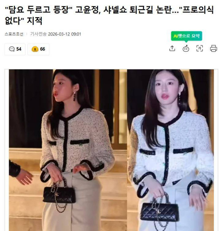 据韩国媒体3月12日报谈,韩国闻名女演员高允贞在巴黎时装周的一段“放工路”视频,不测表韩网掀翻了一场对于“专科精神”的热烈辩白。这位香奈儿品牌大使在秀场外的一个举动,被镜头捕捉并放大后,飞速从先锋花絮演变为一场世界形象的凝视。