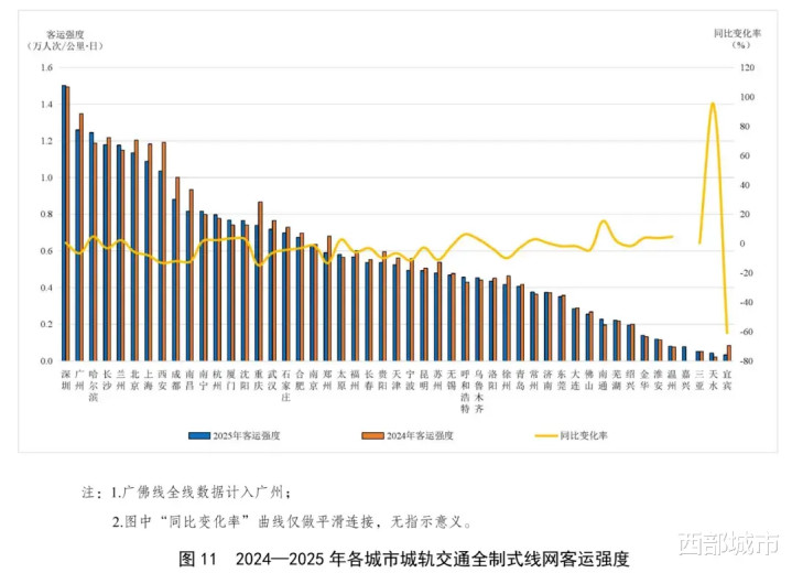 客运强度方面,2025年全制式抽象线网平均客运强度名次前五的城市为:深圳1.50万东谈主次/公里·日、广州1.26、哈尔滨1.25、长沙1.18、兰州1.18。