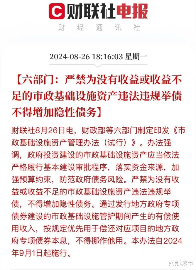 2024年,财政部等六部门发文:严禁为莫得收益或收益不及的市政基础行径金钱犯罪违法举债,不得加多隐性债务。