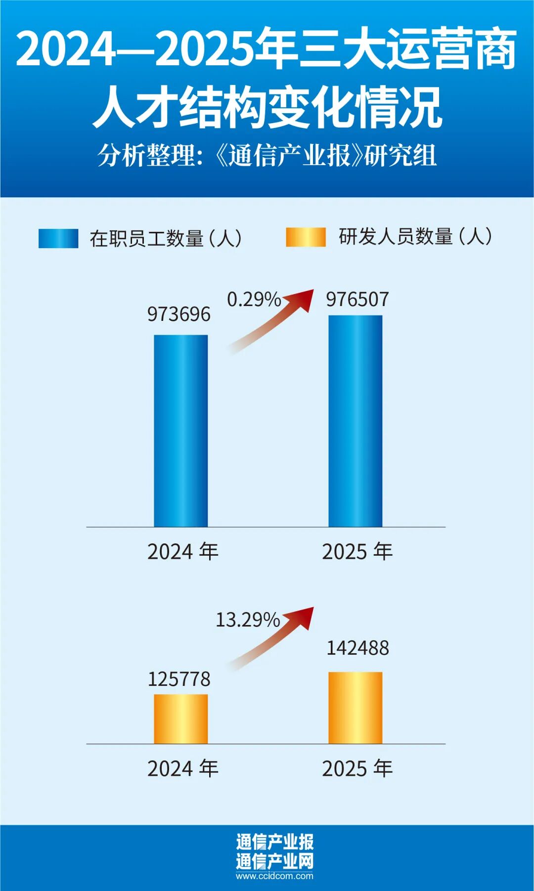 数据浮现,2025年三大运营商在任职工97.65万东谈主,同比增长0.29%;三大运营商研发东谈主员还是突破14.25万东谈主,同比增长13.29%。同期,料理岗、运维岗、较低学历岗明显减轻。不问可知,在运营商总职工数逐渐增长的趋势下,研发东谈主员增长明显。进退之间,三大运营商的东谈主才架构正从“限度延迟”到“结构优化”,从“基础就业”到“科技启动”进行重塑。